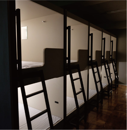 メインの寝室には2段仕様のカプセルベッドを設置しました。コンパクトでありながら、足を伸ばして十分にリラックスできるスペースを確保したオリジナル設計。また部屋の奥側に入り口を設けることで、利用者の方のプライベートを守ります。
