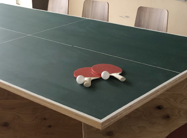 既設されているテーブルは、ひっくり返せば卓球台に早変わり。ラケット、ネット、ボールも完備されているので、2人以上が集まればすぐにでもゲームが開始できます。体を動かすことで気分転換になり、チームの距離を縮めるレクリエーションにも最適です。
